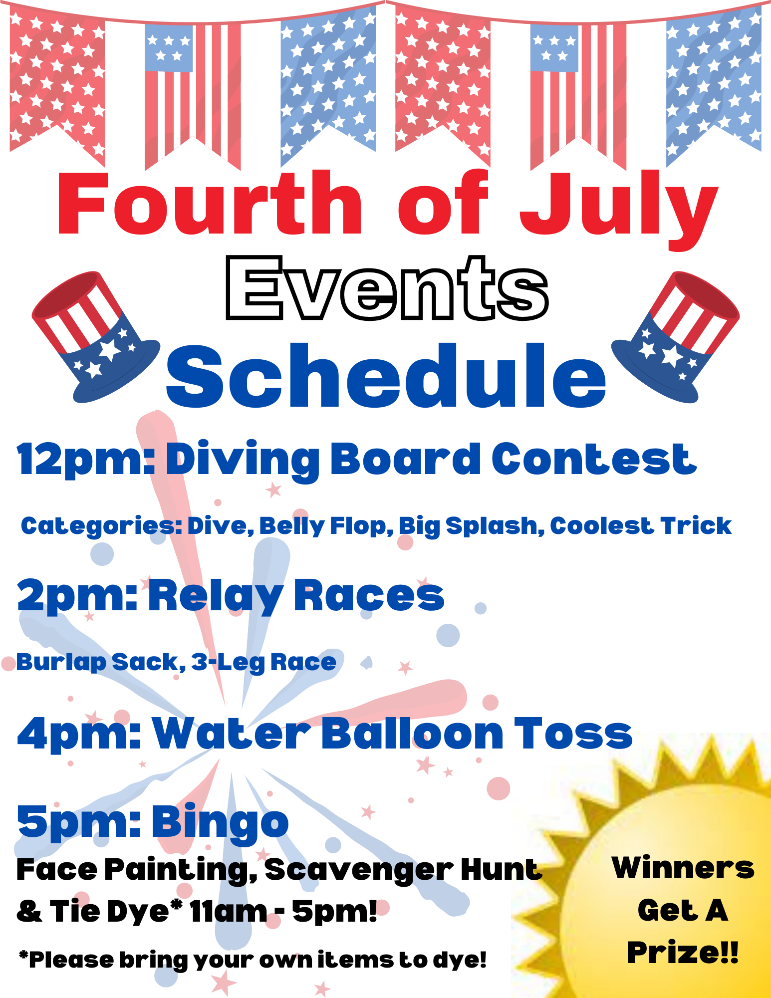 We will be holding events at the pool on July 4th from 12pm – 5pm.