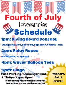 We will be holding events at the pool on July 4th from 11am – 5pm.